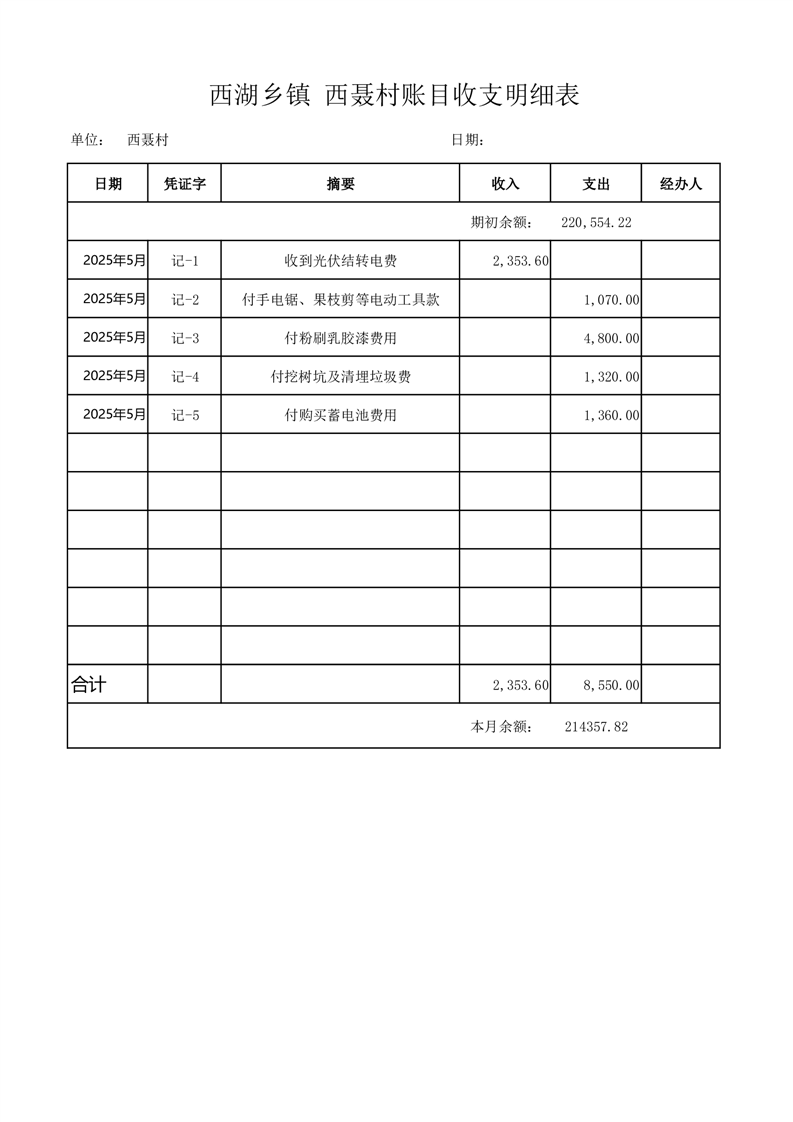 2025年5月份西湖镇西聂村账目收支情况表