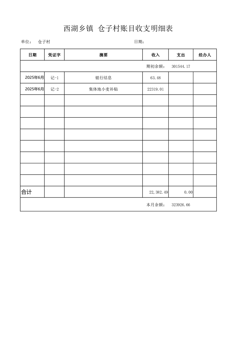 2025年6月份西湖镇仓子村账目收支情况表