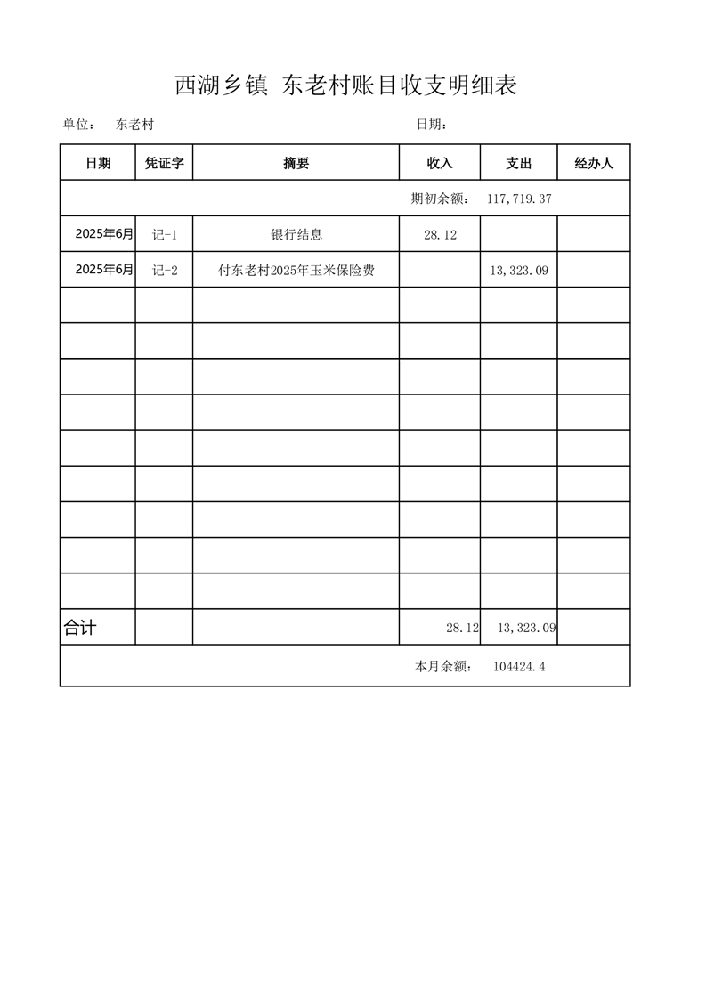 2025年6月份西湖镇东老村账目收支情况表