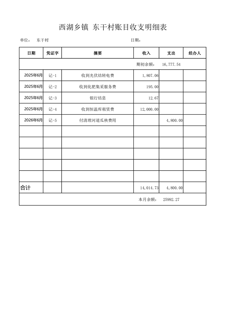 2025年6月份西湖镇东干村账目收支情况表