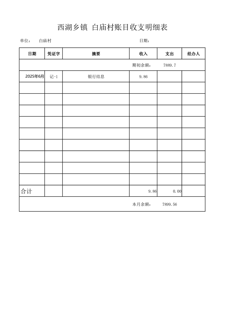 2025年6月份西湖镇白庙村账目收支情况表