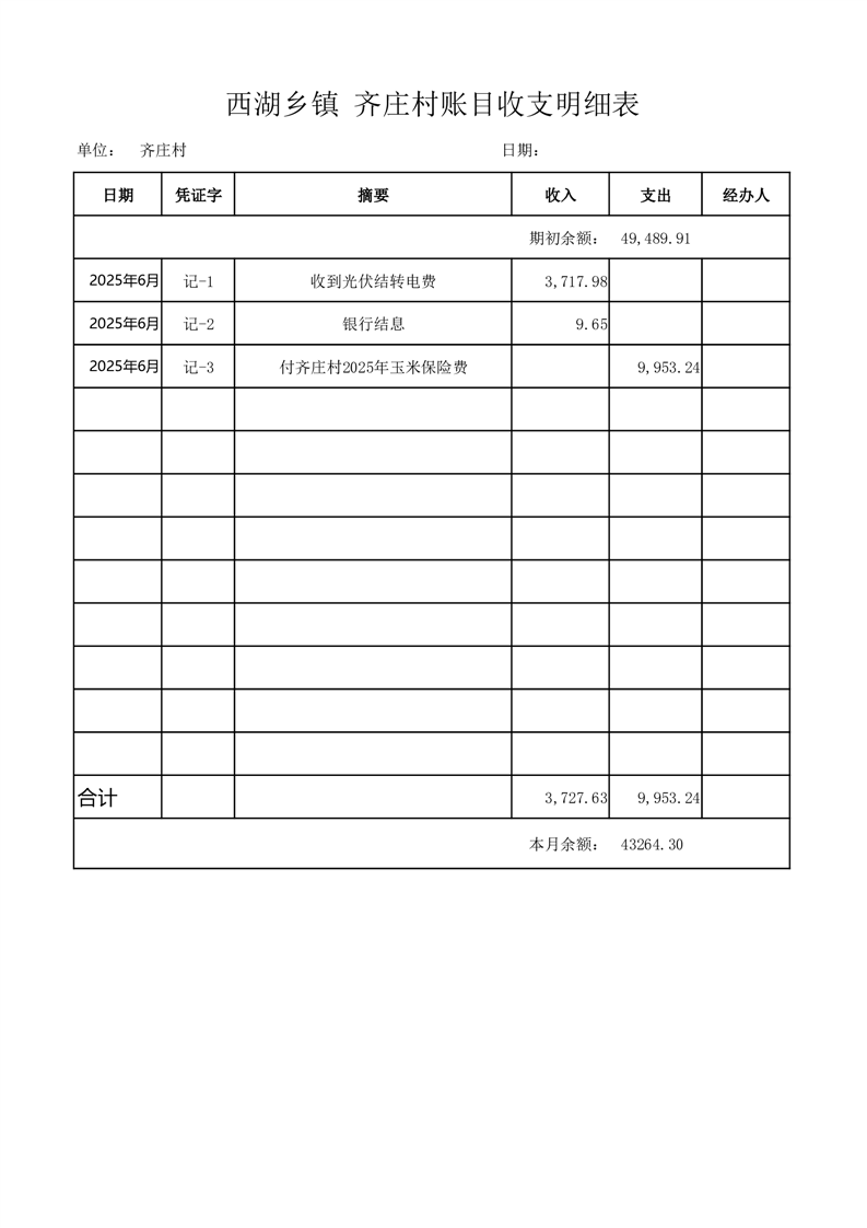 2025年6月份西湖镇齐庄村账目收支情况表