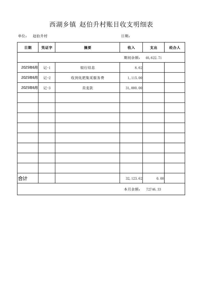 2025年6月份西湖镇赵伯升村账目收支情况表