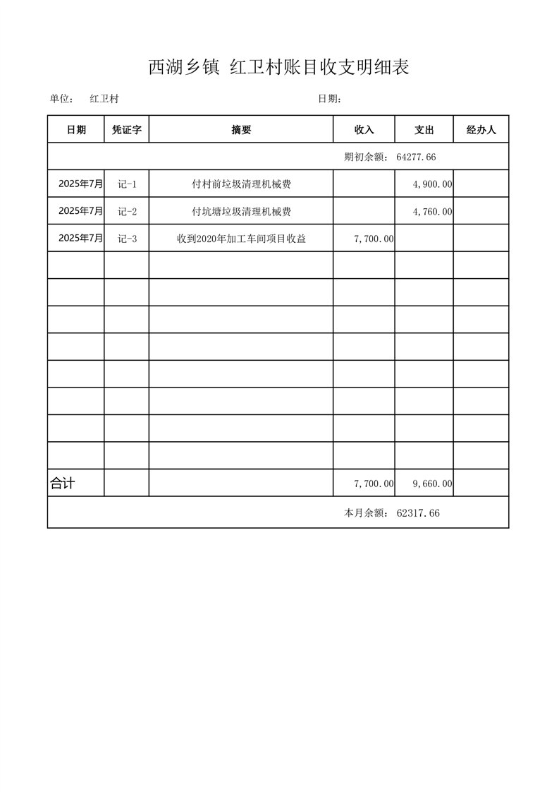 2025年7月份西湖镇红卫村账目收支情况表