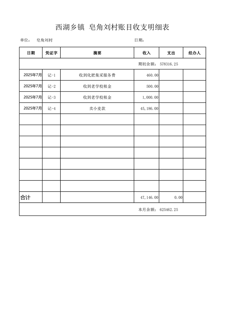 2025年7月份西湖镇皂刘村账目收支情况表