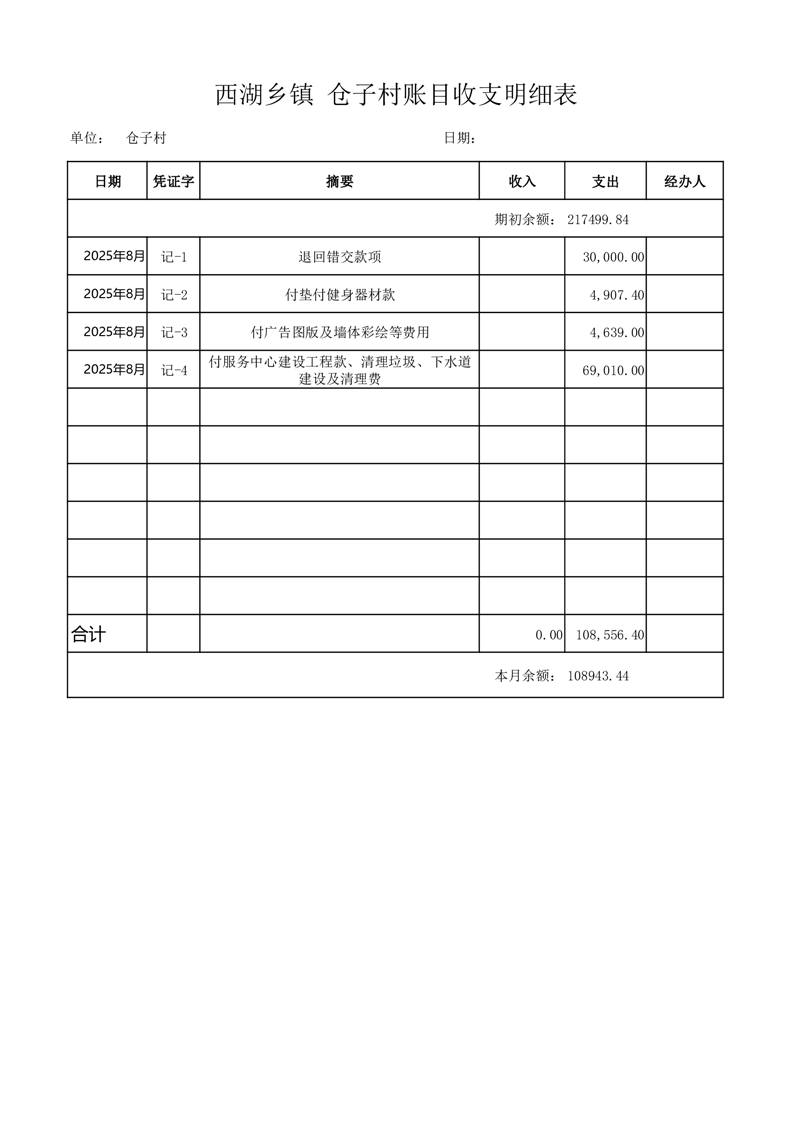 2025年8月份西湖镇仓子村账目收支情况表