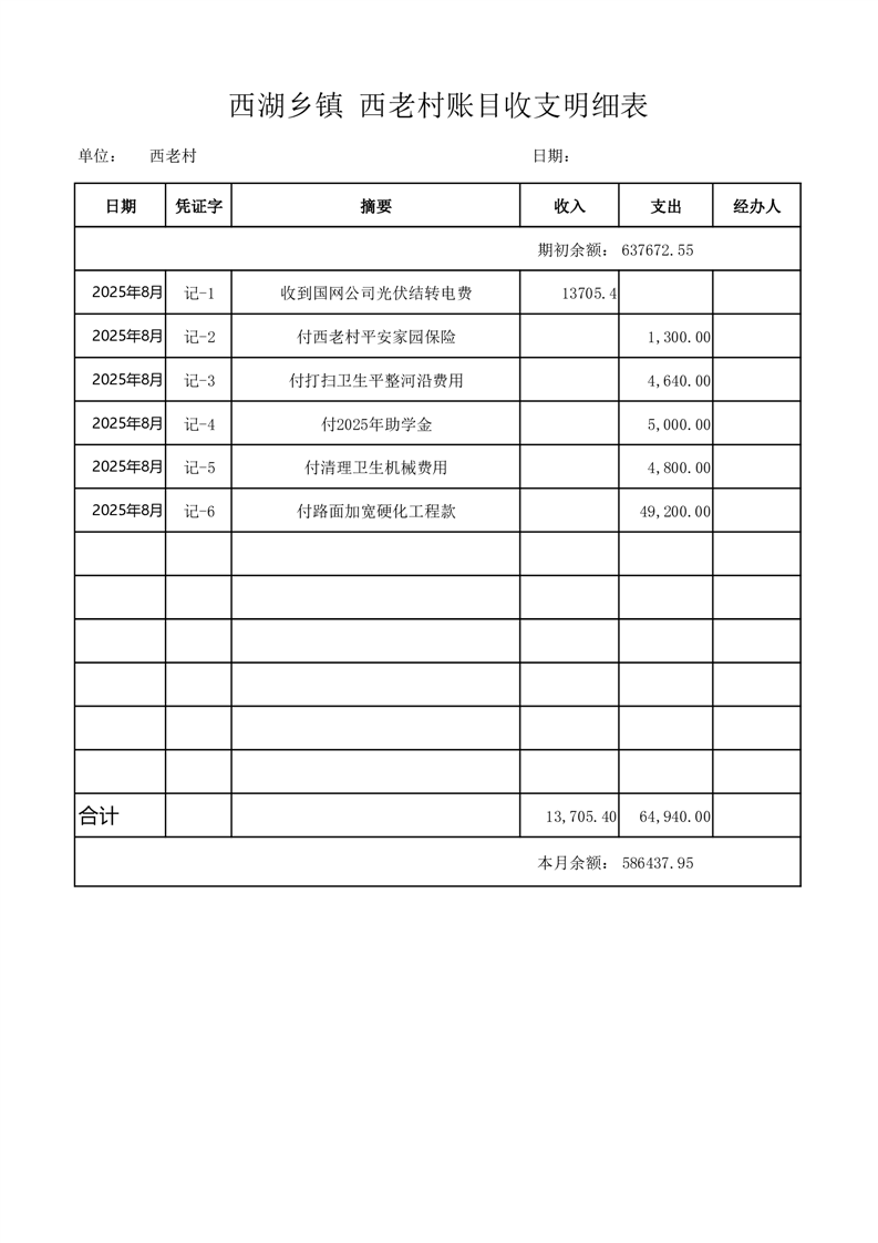 2025年8月份西湖镇西老村账目收支情况表