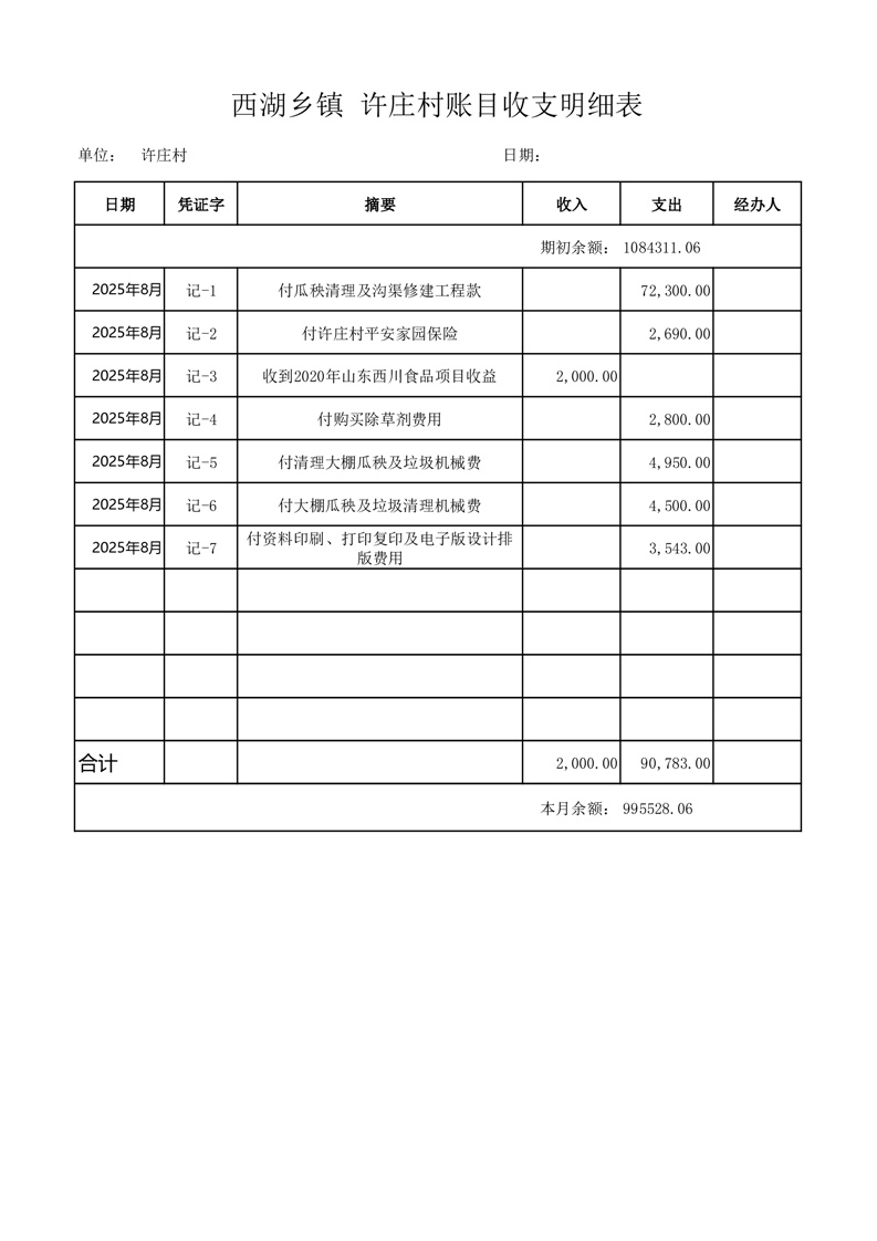 2025年8月份西湖镇许庄村账目收支情况表