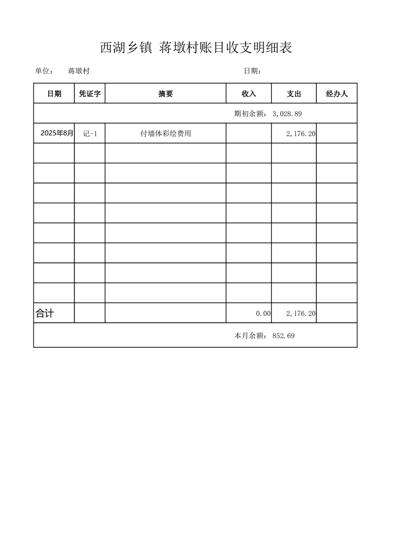 2025年8月份西湖镇蒋墩村账目收支情况表