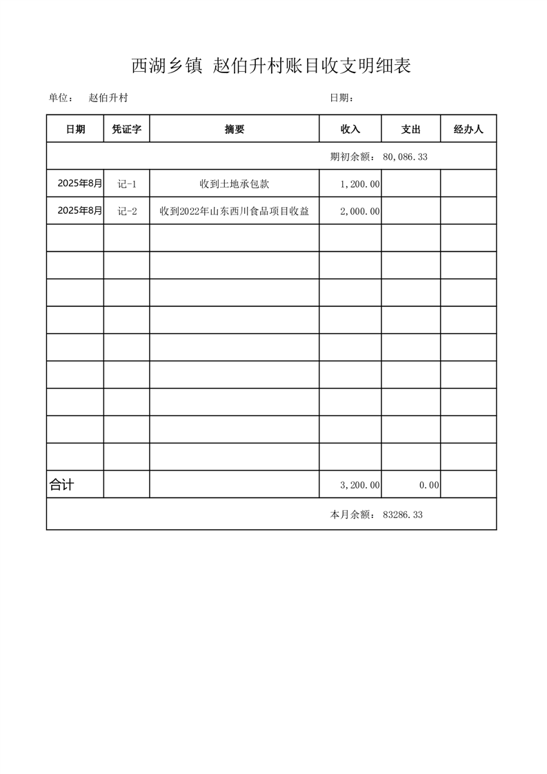 2025年8月份西湖镇赵伯升村账目收支情况表