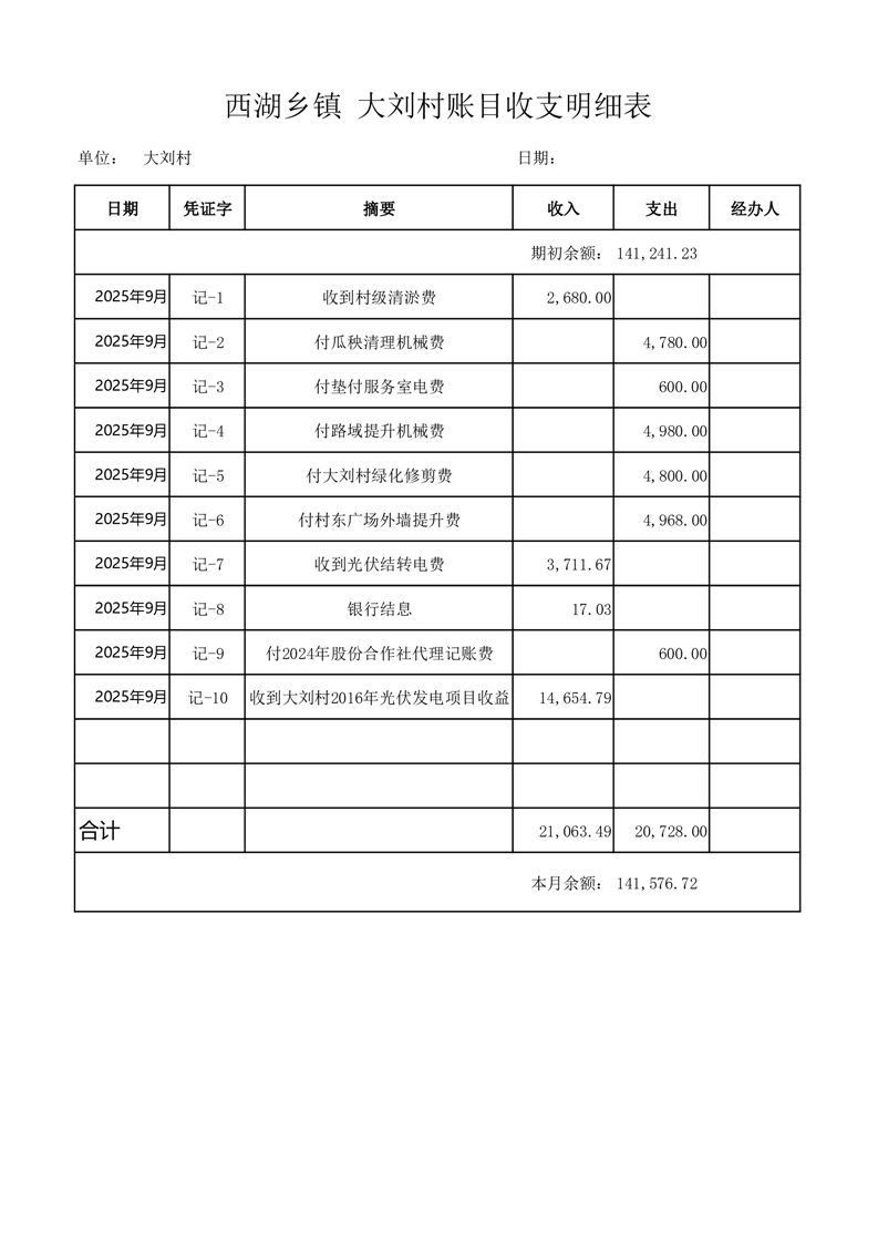 2025年9月份西湖镇大刘村账目收支情况表