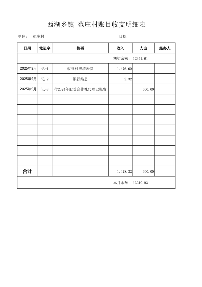 2025年9月份西湖镇范庄村账目收支情况表