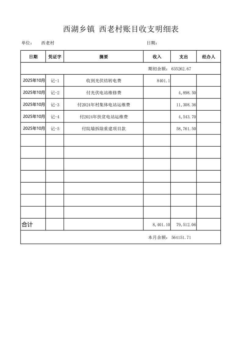 2025年10月份西湖镇西老村账目收支情况表