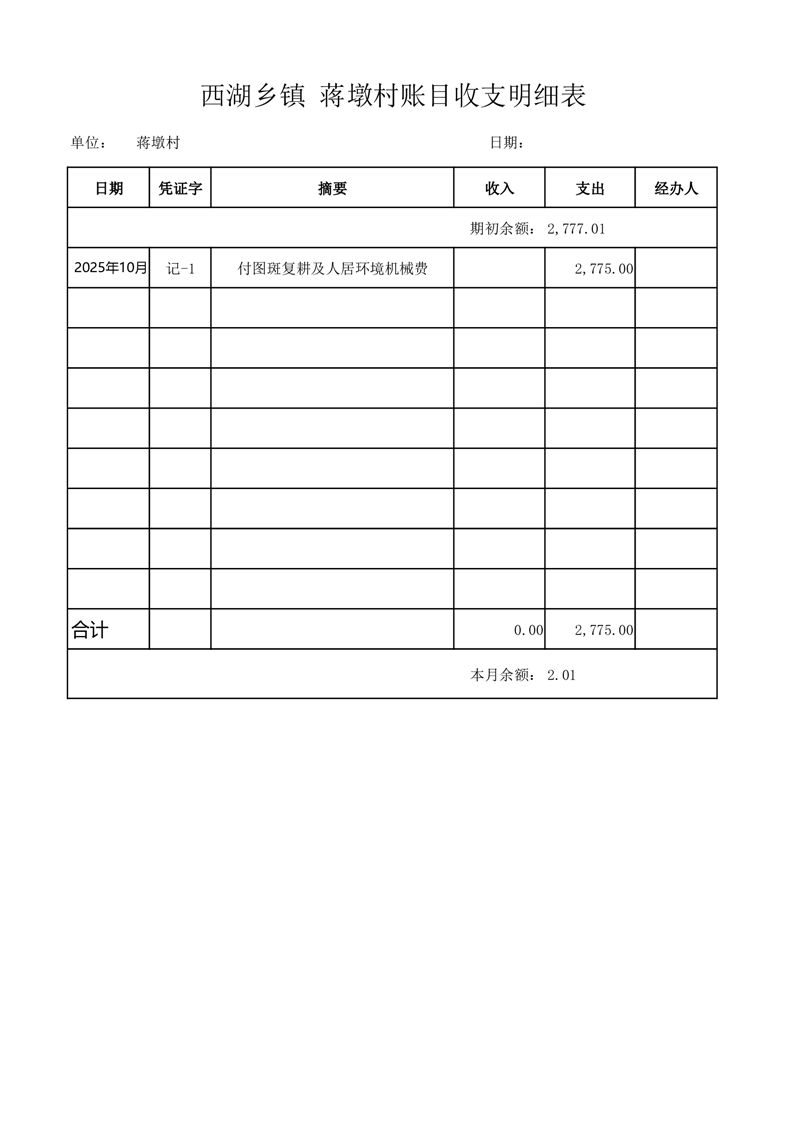 2025年10月份西湖镇蒋墩村账目收支情况表