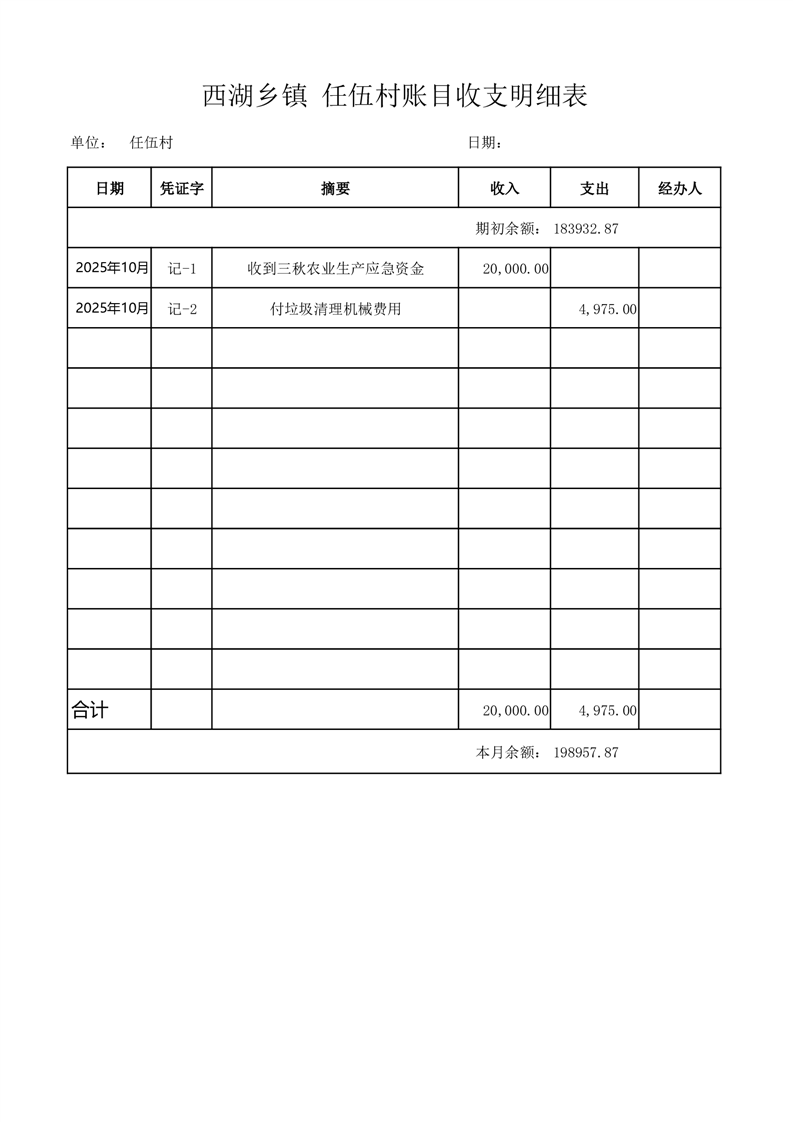 2025年10月份西湖镇任伍村账目收支情况表