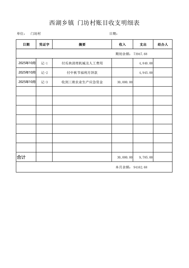 2025年10月份西湖镇门坊村账目收支情况表