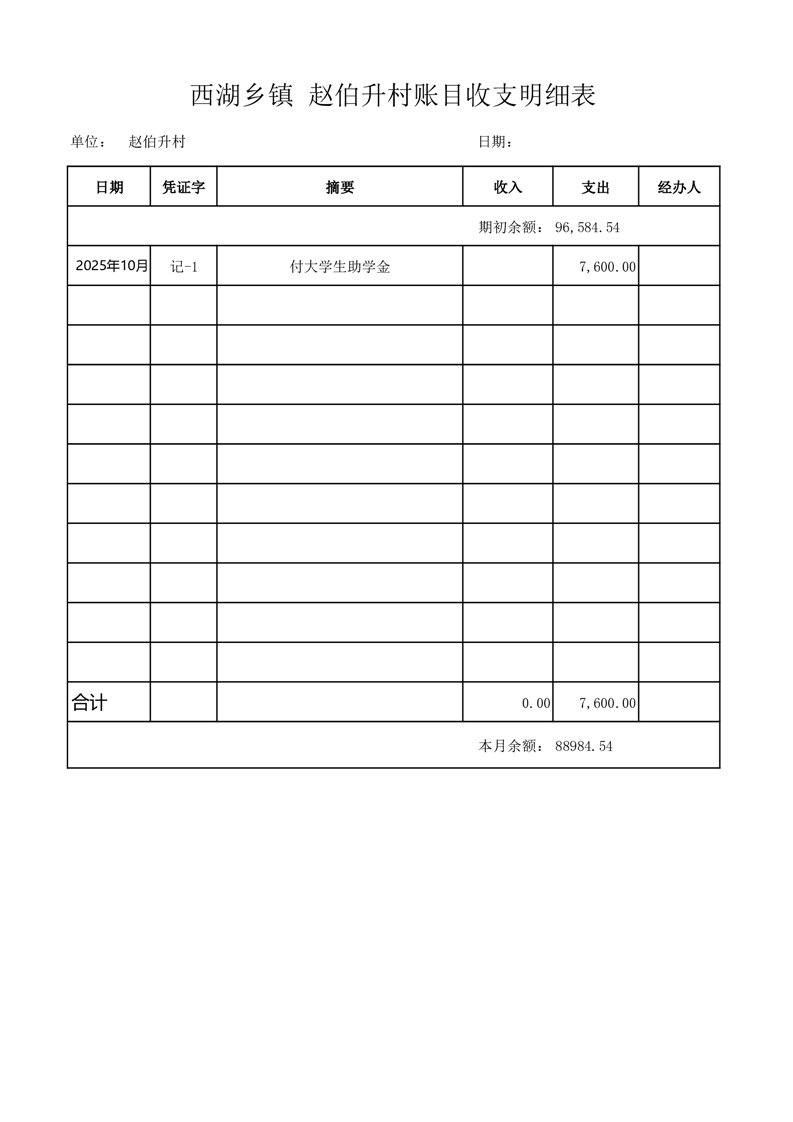 2025年10月份西湖镇赵伯升村账目收支情况表