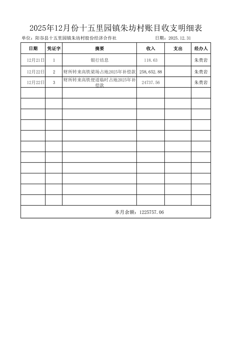 2025年12月份十五里园镇朱坊村账目收支明细表