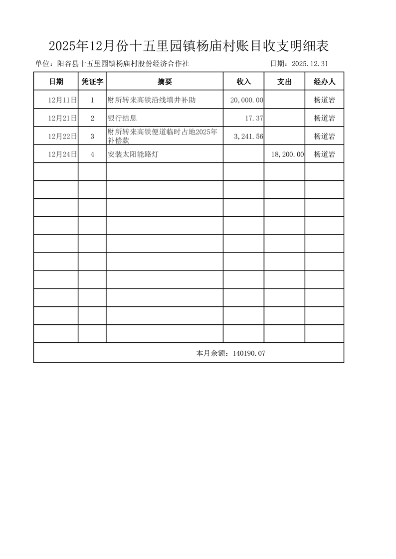 2025年12月份十五里园镇杨庙村账目收支明细表