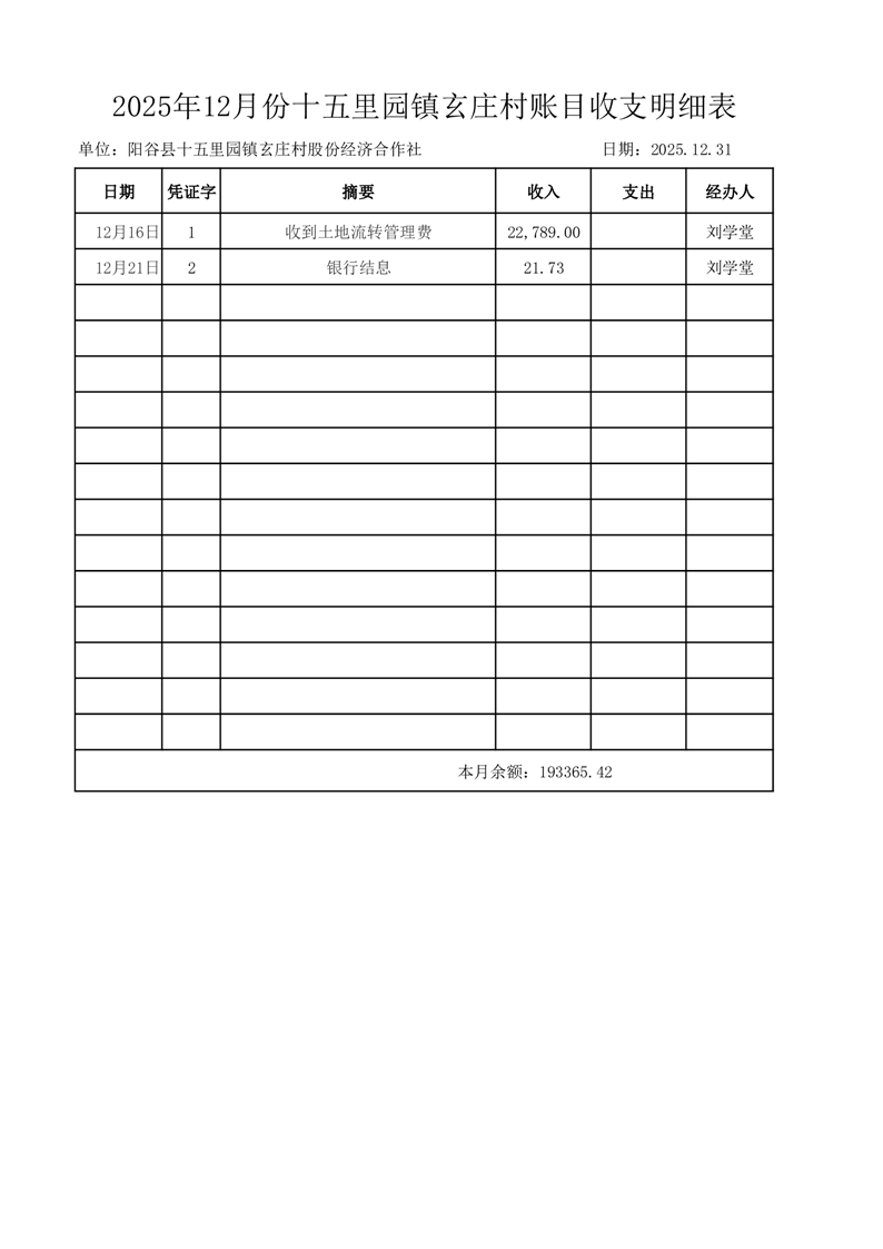 2025年12月份十五里园镇玄庄村账目收支明细表