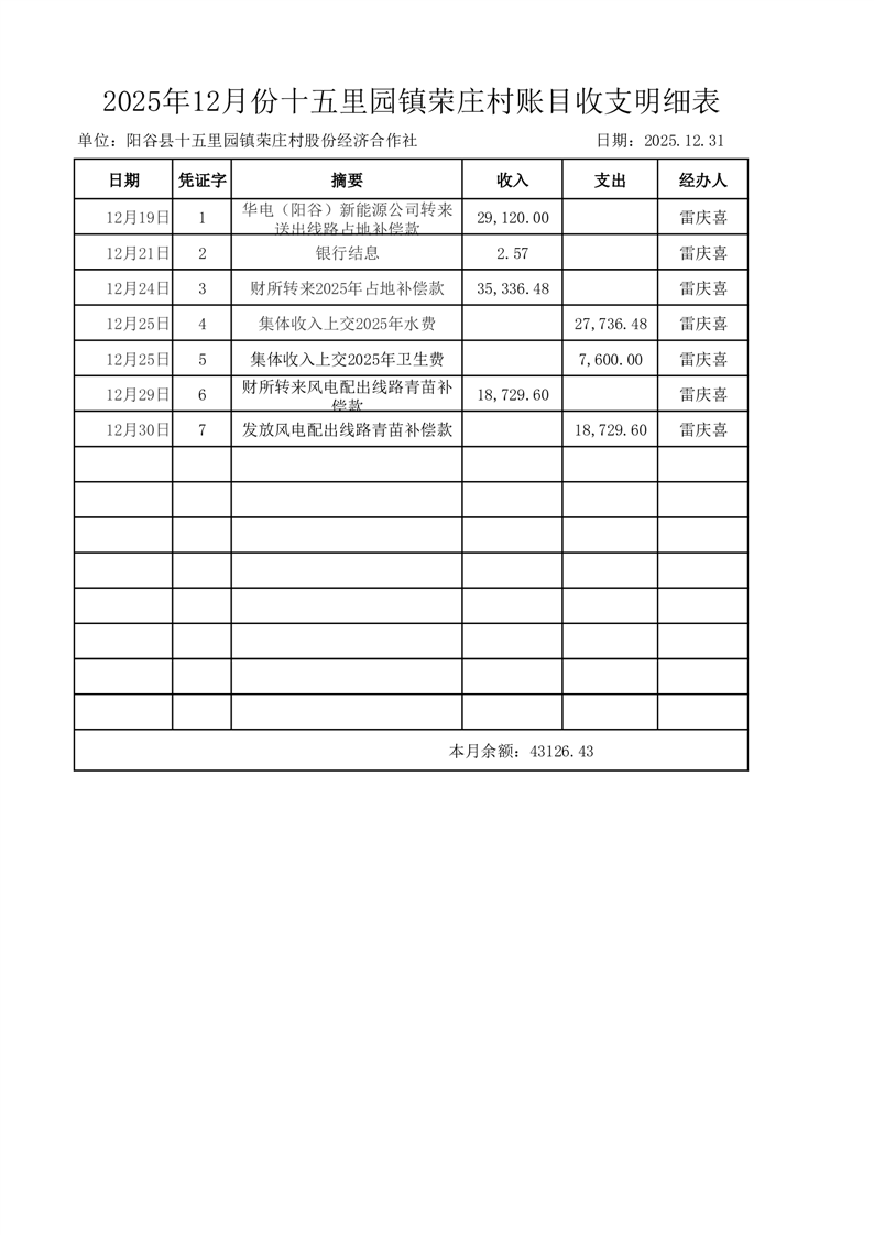 2025年12月份十五里园镇荣庄村账目收支明细表
