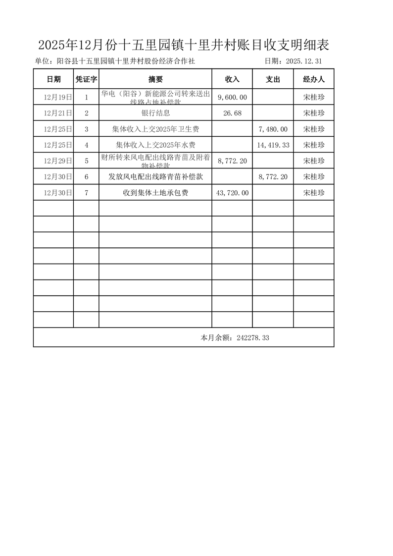 2025年12月份十五里园镇十里井村账目收支明细表