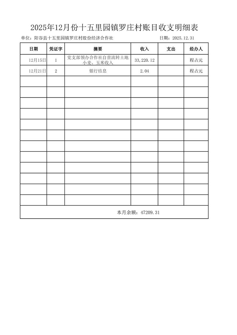 2025年12月份十五里园镇罗庄村账目收支明细表