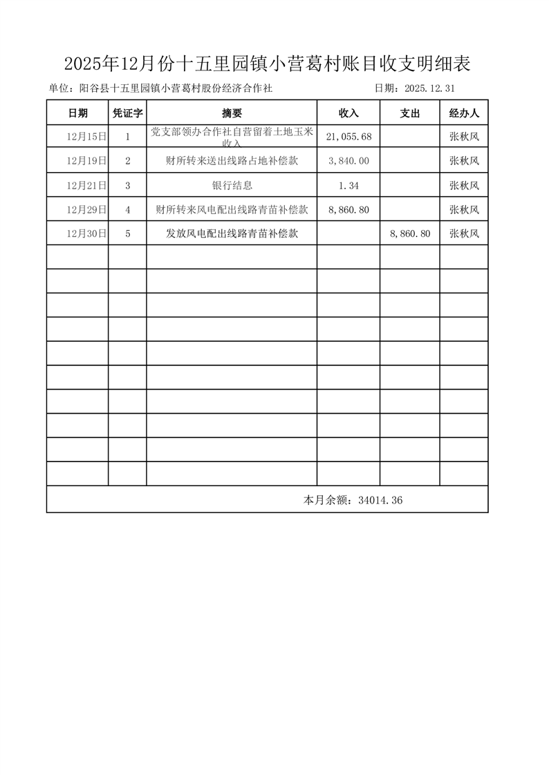 2025年12月份十五里园镇小营葛村账目收支明细表