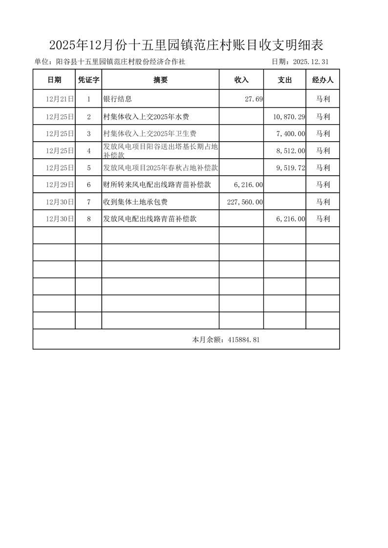 2025年12月份十五里园镇范庄村账目收支明细表