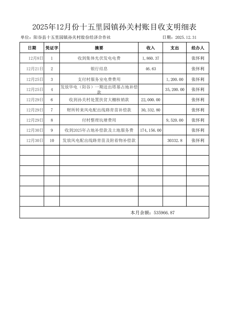 2025年12月份十五里园镇孙关村账目收支明细表