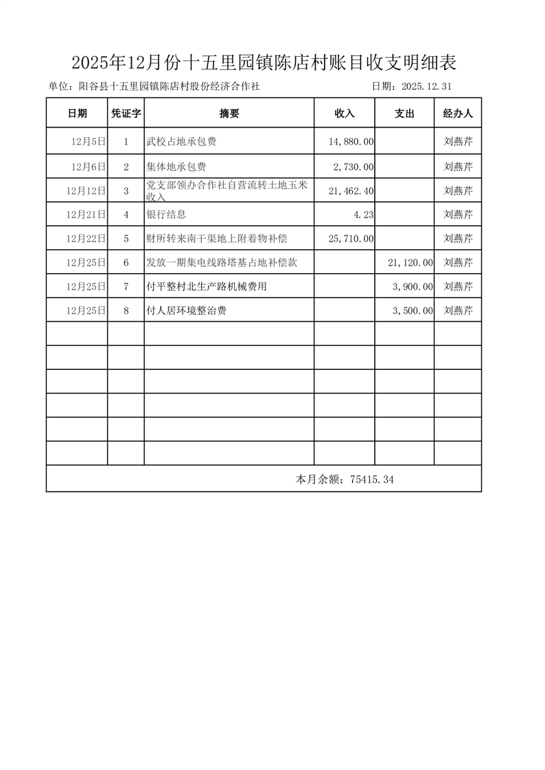 2025年12月份十五里园镇陈店村账目收支明细表