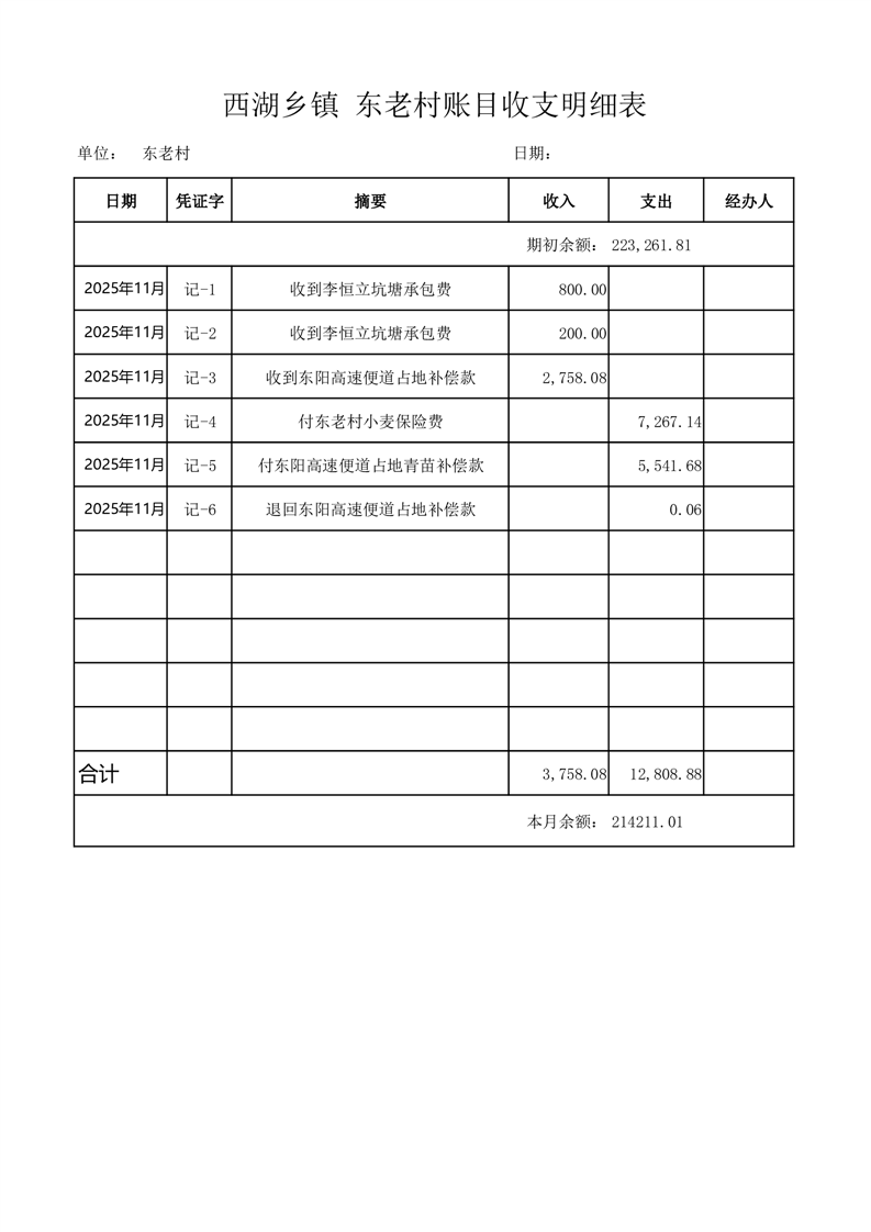 2025年11月份西湖镇东老村账目收支情况表
