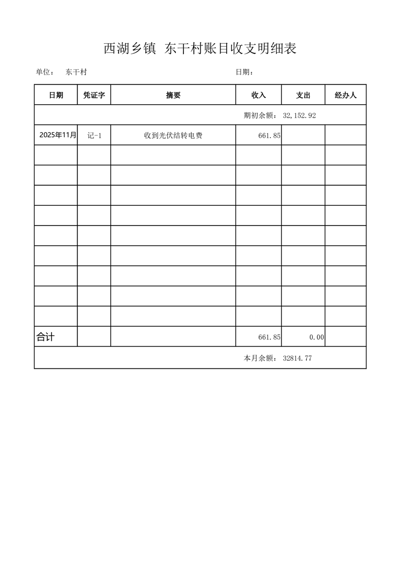 2025年11月份西湖镇东干村账目收支情况表
