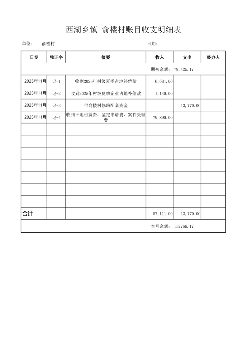 2025年11月份西湖镇俞楼村账目收支情况表