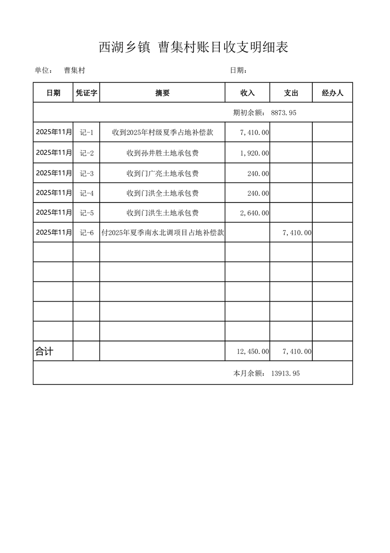 2025年11月份西湖镇曹集村账目收支情况表