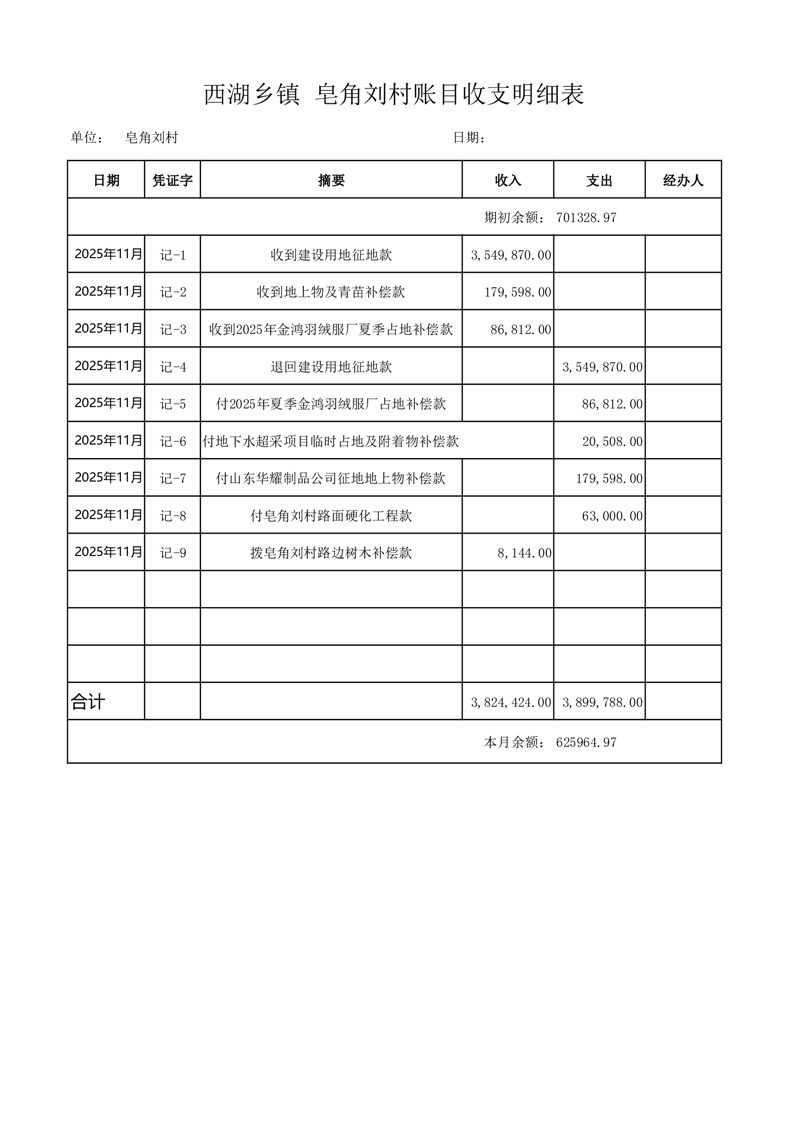 2025年11月份西湖镇皂刘村账目收支情况表