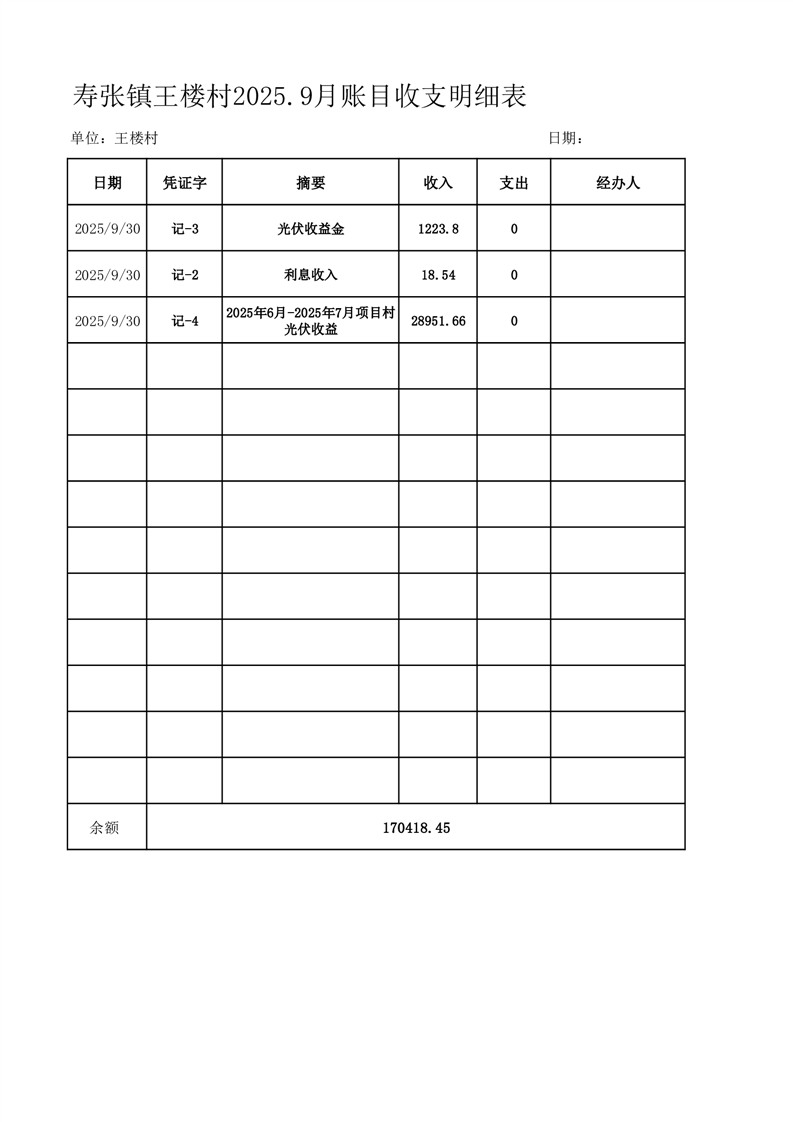 寿张镇王楼村2025.9月账目收支明细表
