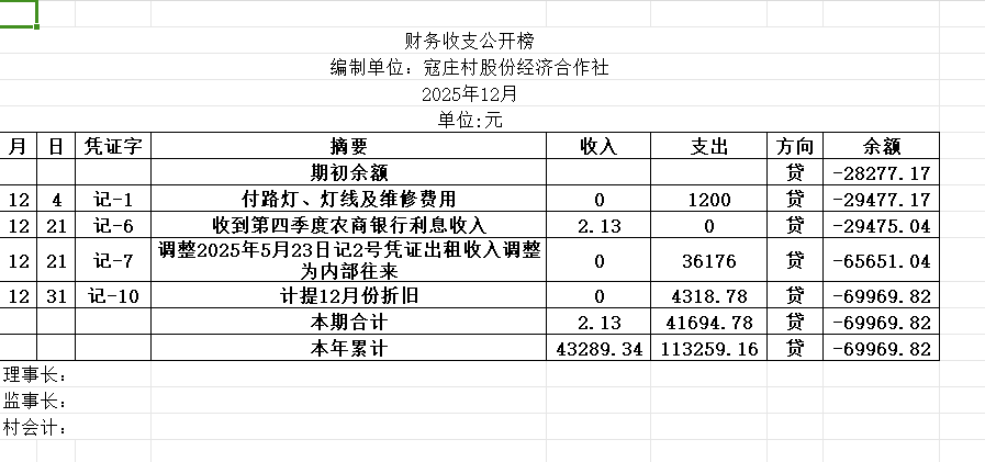 阿城镇寇庄村2025年12月份账目收支明细表