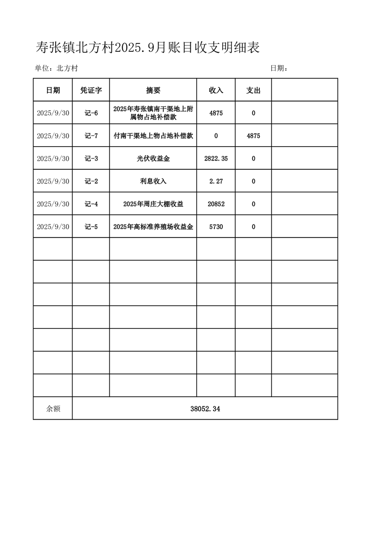 寿张镇北方村2025.9月账目收支明细表