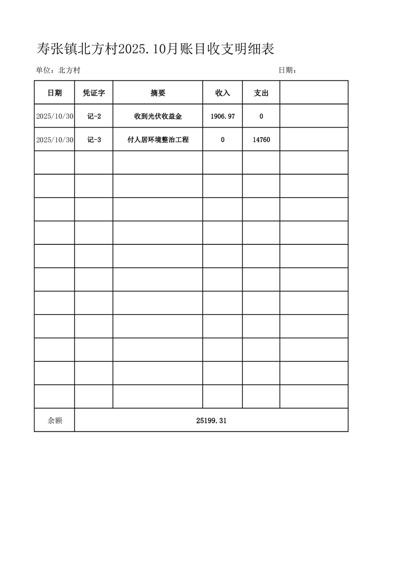 寿张镇北方村2025.10月账目收支明细表