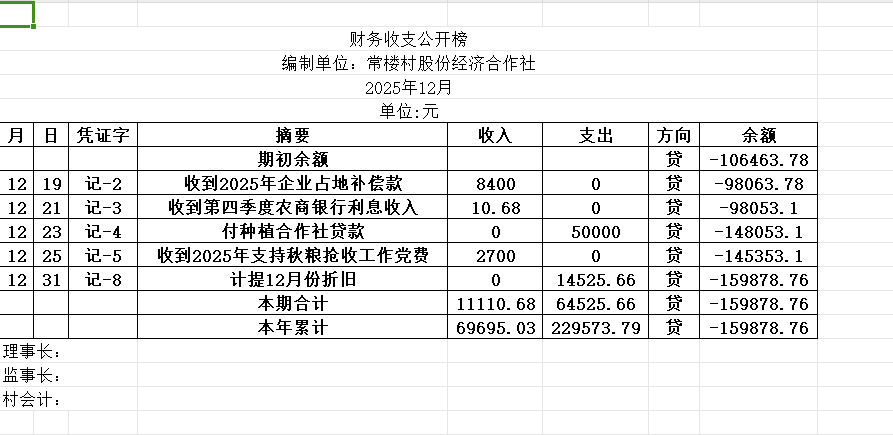阿城镇常楼村2025年12月份账目收支明细表