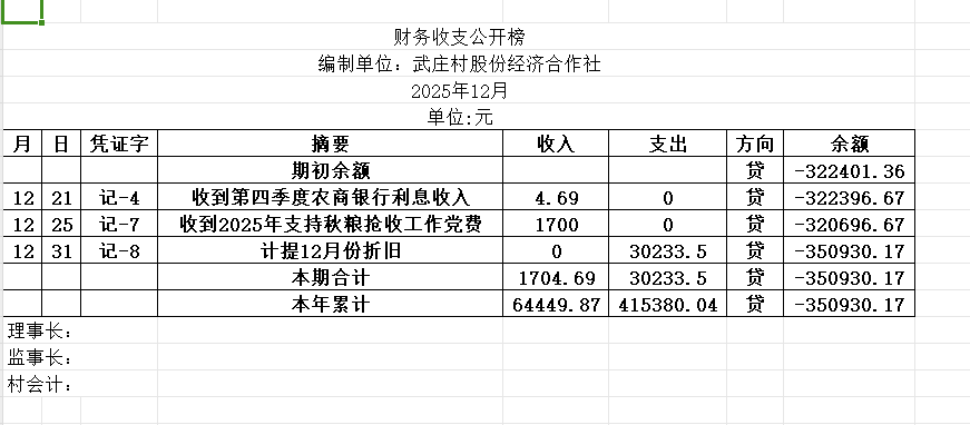 阿城镇武庄村2025年12月份账目收支明细表