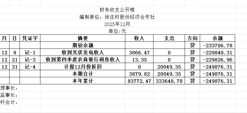 阿城镇徐庄村2025年12月份账目收支明细表