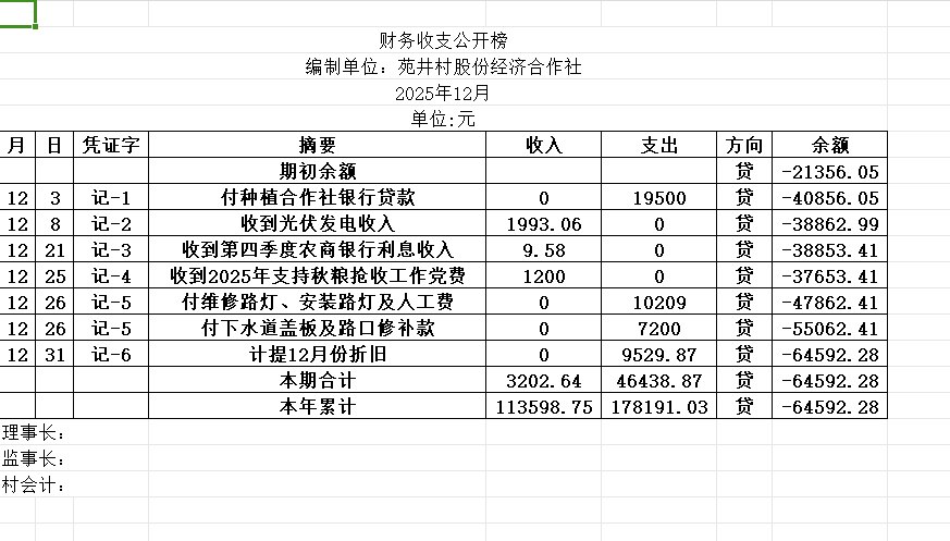 阿城镇苑井村2025年12月份账目收支明细表