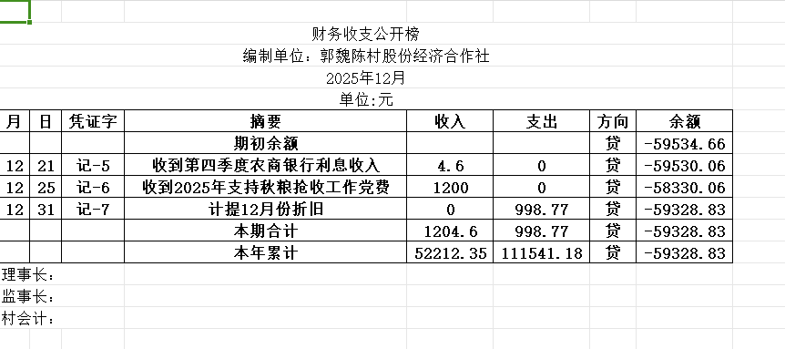 阿城镇郭魏陈村2025年12月份账目收支明细表