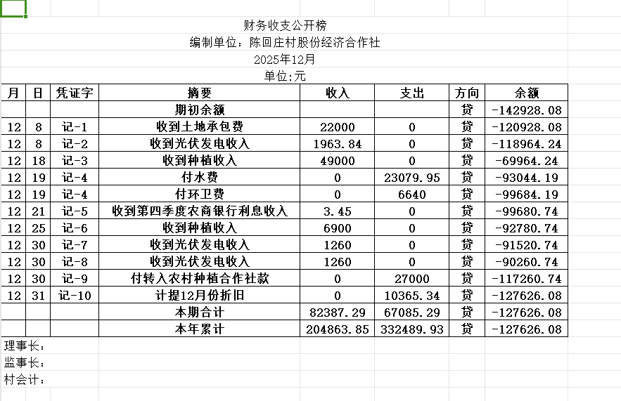 阿城镇陈回庄村2025年12月份账目收支明细表