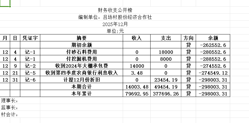 阿城镇吕场村2025年12月份账目收支明细表