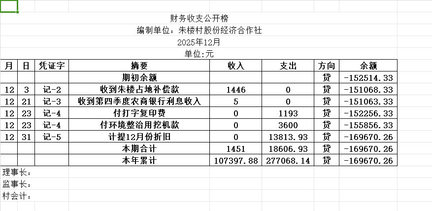 阿城镇朱楼村2025年12月份账目收支明细表