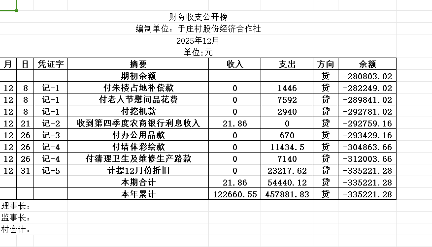 阿城镇于庄村2025年12月份账目收支明细表