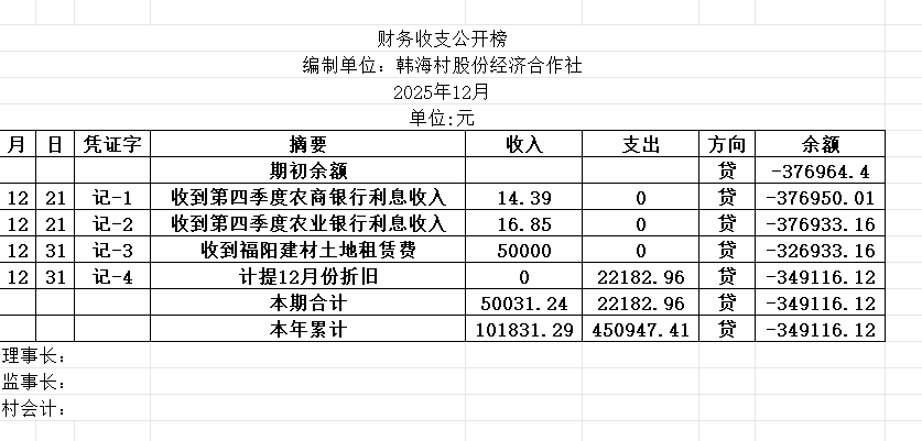阿城镇韩海村2025年12月份账目收支明细表